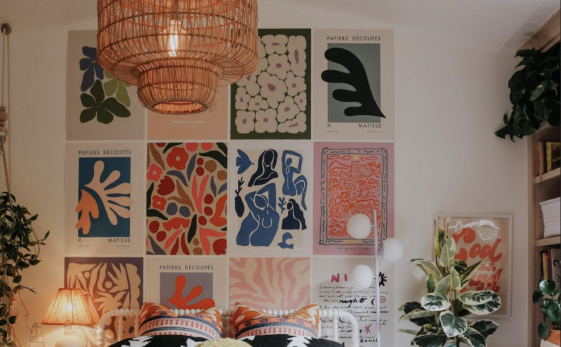• Gallery wall: Đây là xu hướng decor rất thịnh hành trên Pinterest. Bạn có thể kết hợp nhiều poster inpostcard với kích thước khác nhau thành một cụm trên cùng một mảng tường. Một mẹo nhỏ là chọn một chủ đề chung (ví dụ: âm nhạc, phong cảnh, quote tạo động lực) để bộ sưu tập trông đồng bộ hơn. Gallery wall phù hợp cho những ai muốn tạo điểm nhấn lớn và cá tính mạnh trong không gian.